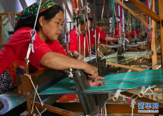 5月24日,惠畅棉花专业合作社的女工在传统织布机上织布。