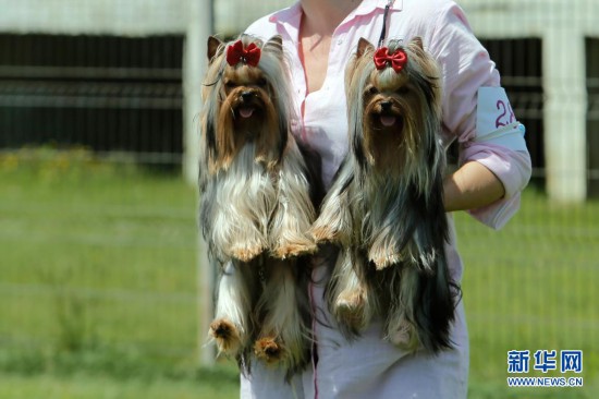 5月23日,两只宠物犬在罗马尼亚首都布加勒斯特参加选美比赛。新华社发(克里斯泰尔摄)