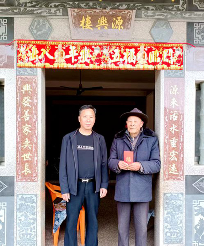 人民网泉州1月26日电 (刘宝琴)虎啸月出关,兔舞天地暖。“每年春节都会收到村里慈善会的节日祝福和慰问红包,心里感觉暖暖的。”今年95岁的陈永昌脸上洋溢着喜悦,他表示自己已经连续多年领到村慈善会的千元红包了。
