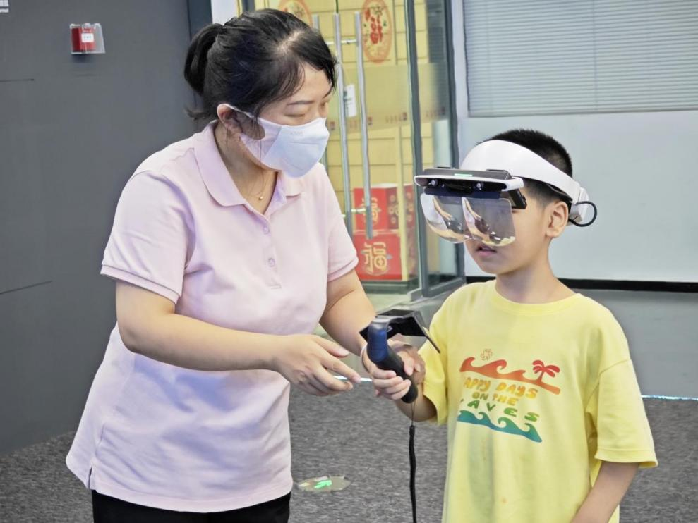 图书城的工作人员帮助小朋友穿戴MR设备。黄东仪摄