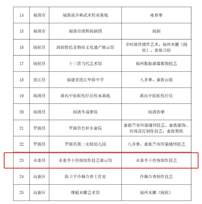 近日,福州市文化和旅游局发布了福州市第九批非物质文化遗产项目传承示范基地名录,其中,永泰李干传统制作技艺展示馆永泰李干传统制作技艺,榜上有名。