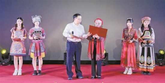 连续举办7年的“多彩中华”民族电影展已成为“金鸡”期间的品牌活动。图为87岁演员祝希娟(右三)在开幕现场朗读展映影片推荐词。