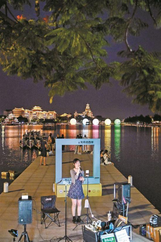 歌手在位于集美学村的龙舟池畔进行表演。林志杰摄