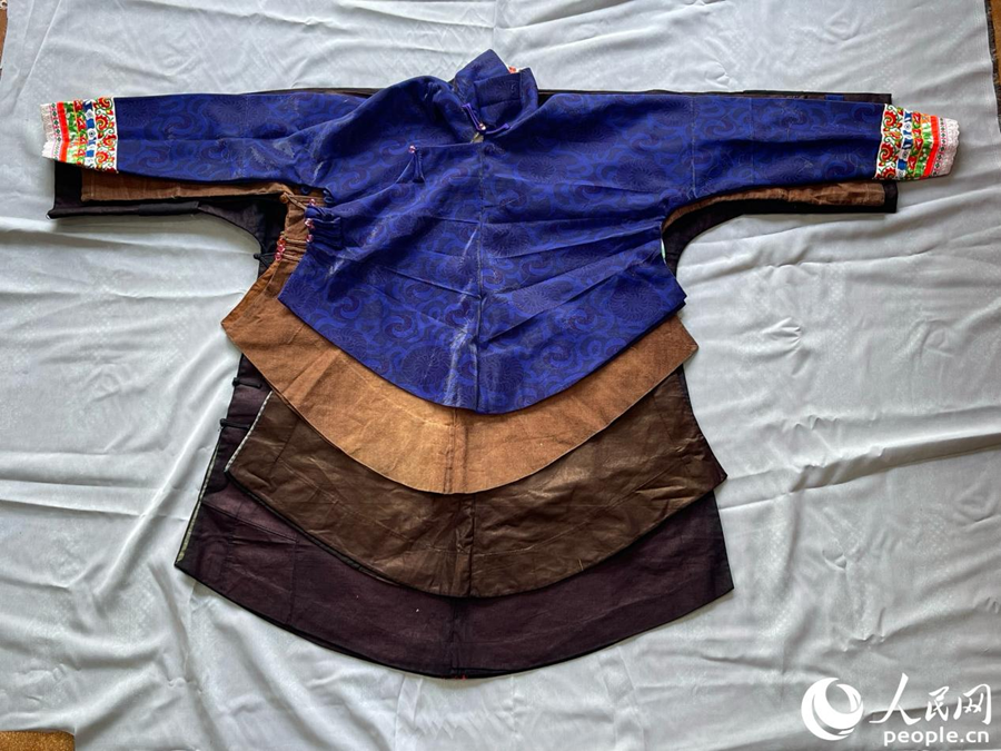 左图为“亮贝”,母亲送给女儿的婚衣礼服;右图为“小橄榄造底”,是女儿送给母亲的祝寿礼服。人民网 杨灏昱摄