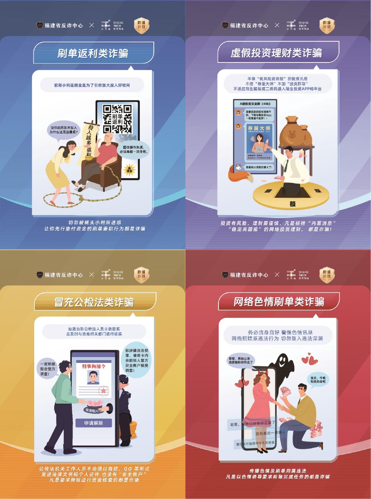 其中在福建地区,数禾科技以公安部刑侦局、国家反诈中心编写的《2025版防范电信网络诈骗宣传手册》为权威指引,聚焦刷单返利、虚假投资理财、冒充公检法、网络色情刷单高发骗局,与福建省反诈中心携手共创,通过具象化的海报设计,让专业反诈知识变得浅显易懂,为居民提供可直接套用的实用反诈指南。针对刷单返利类诈骗,海报提示切勿被蝇头小利所迷惑,先行垫付资金的刷单简直行为都是诈骗;针对虚假投资理财类诈骗中“低风险高回报”“内幕消息”“荐股大师”等典型话术,海报提炼出“四不”反诈准则——不信低风险高回报投资讯息、不信荐股大师、不加投资群聊、不通过陌生链接或二维码进入投资平台;“冒充公检法类诈骗”海报重点提醒居民核实执法人员身份的关键步骤;“网络色情刷单”海报既明确警示诈骗风险,又点明网络招嫖的违法属性,实现反诈与普法的双重赋能,全方位引导居民守好“钱袋子”。