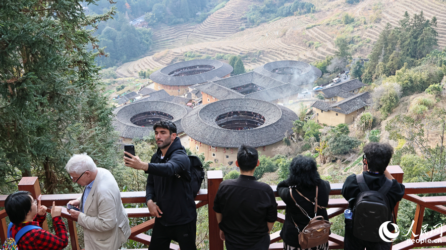 来自欧洲的旅游达人在观景台拍摄“四菜一汤”,感受福建土楼的魅力。人民网记者 李昌乾摄