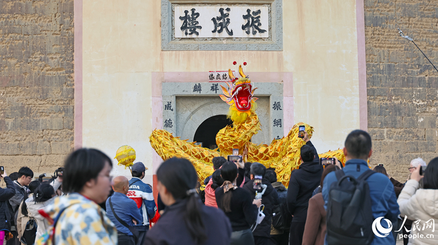 位于福建省龙岩市永定区的振成楼,游客围观舞龙表演,古楼间洋溢着浓浓年味。人民网记者 李昌乾摄