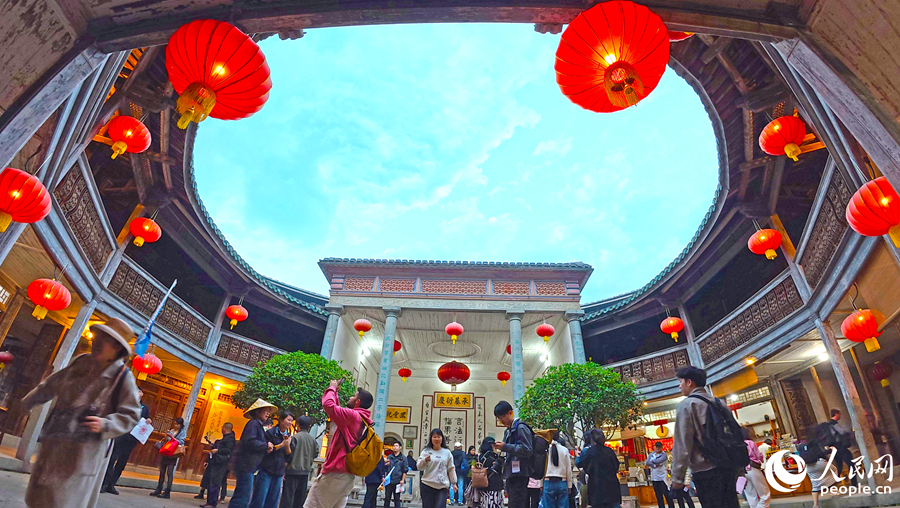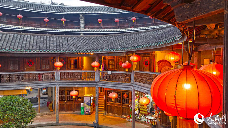土楼内,红灯笼高挂,游客驻足拍照,年味十足。人民网记者 李昌乾摄