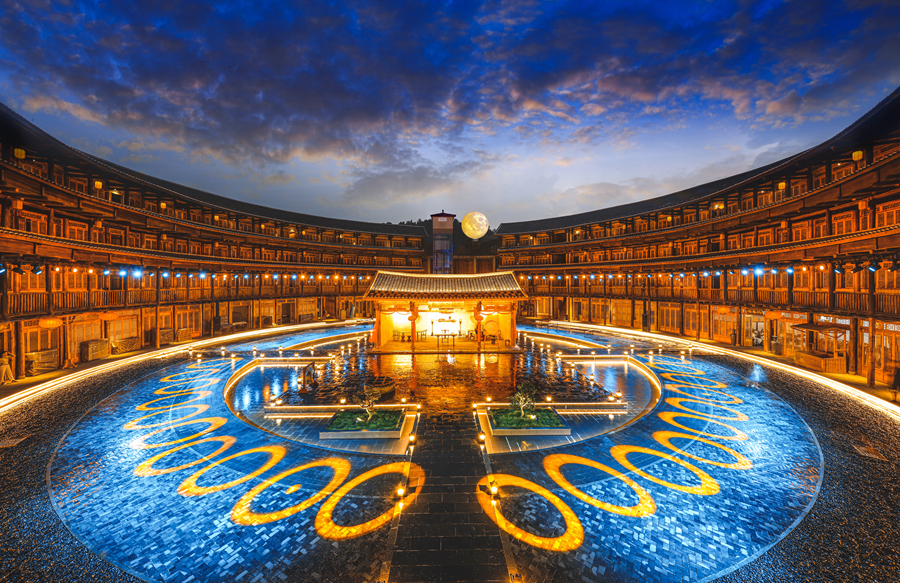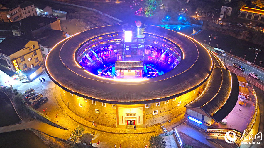 位于福建省龙岩市永定区的环兴楼夜灯璀璨。李艺爽摄