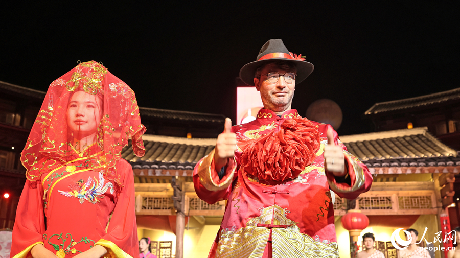 来自欧洲的游客(右)沉浸式体验客家中式婚礼。人民网记者 李昌乾摄