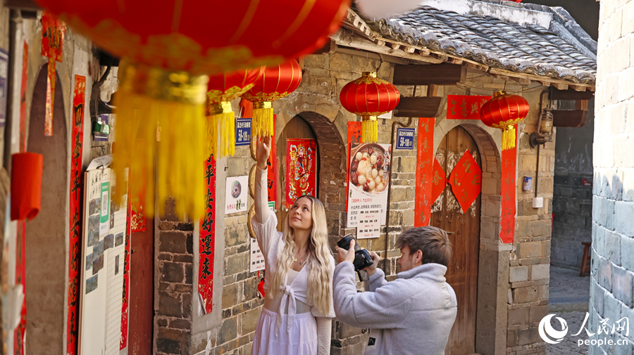 在承启楼内,红灯笼高挂,来自欧洲旅游达人打卡留影,提前感受中国年味。人民网记者 李昌乾摄