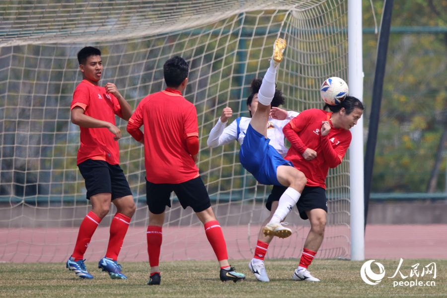 热身交流赛中的“临门一脚”。人民网记者 陈博摄