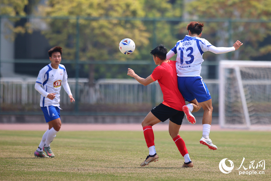 球员高高跃起,争夺空中的足球。人民网记者 陈博摄