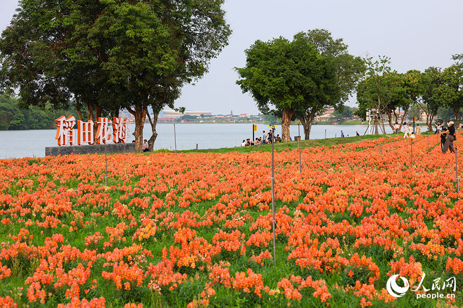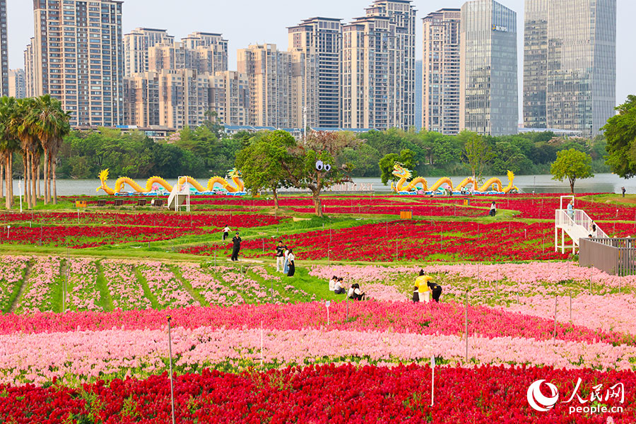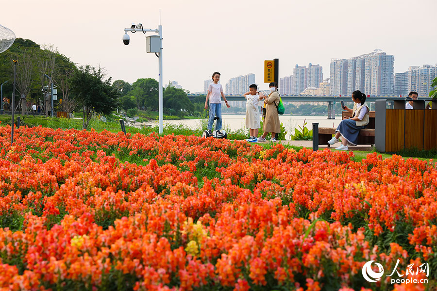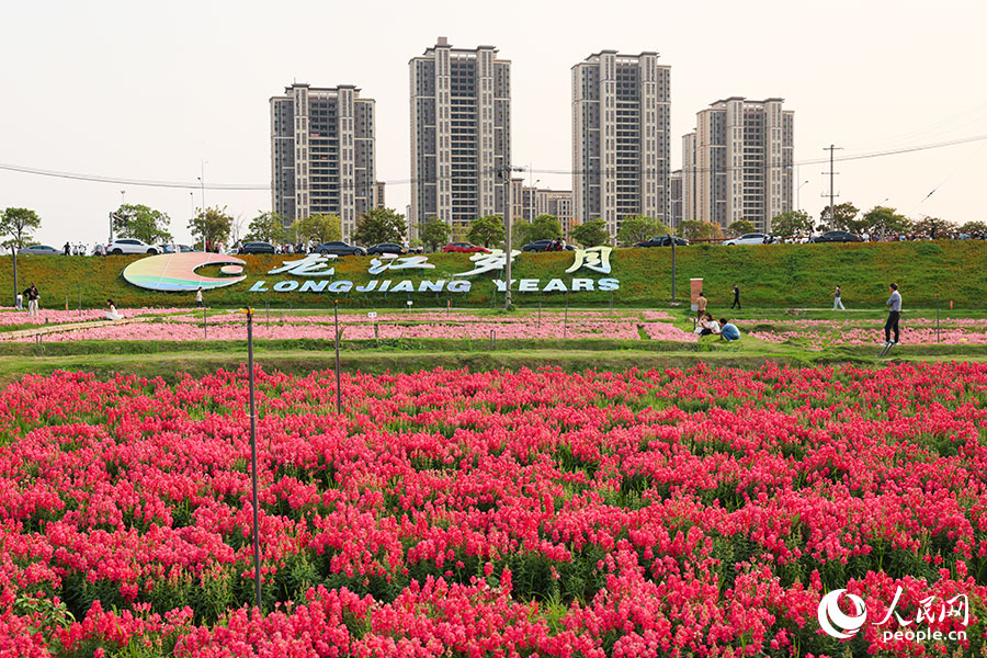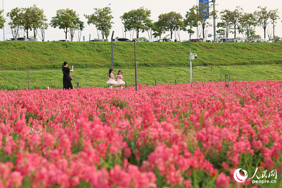 连片的橙色、粉色花田沿江铺开。人民网记者 焦艳摄
