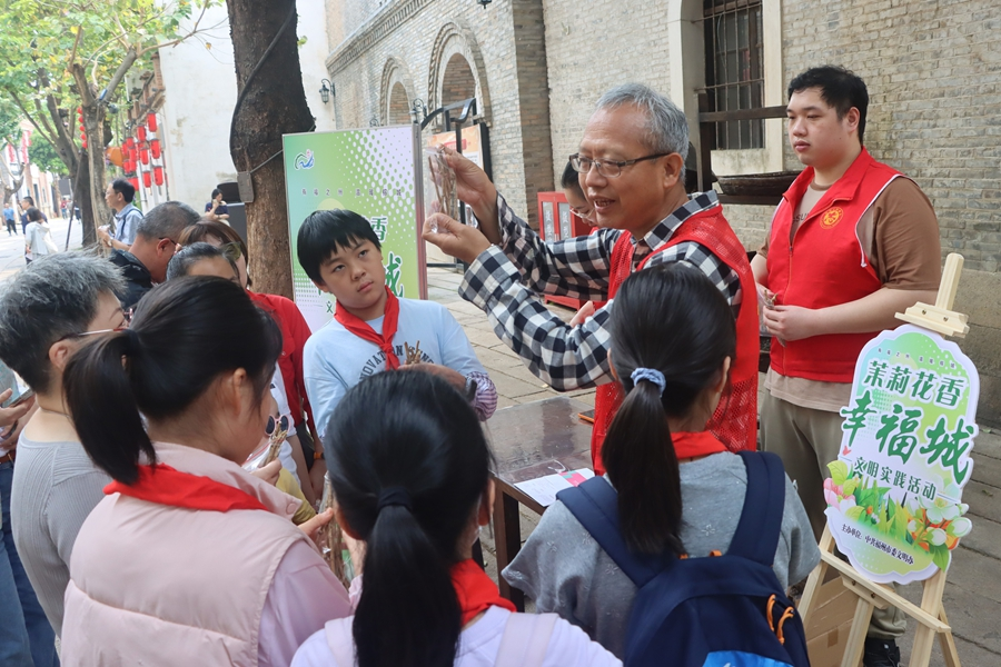 志愿者现场普及茉莉花的养护方式。福州市委文明办供图