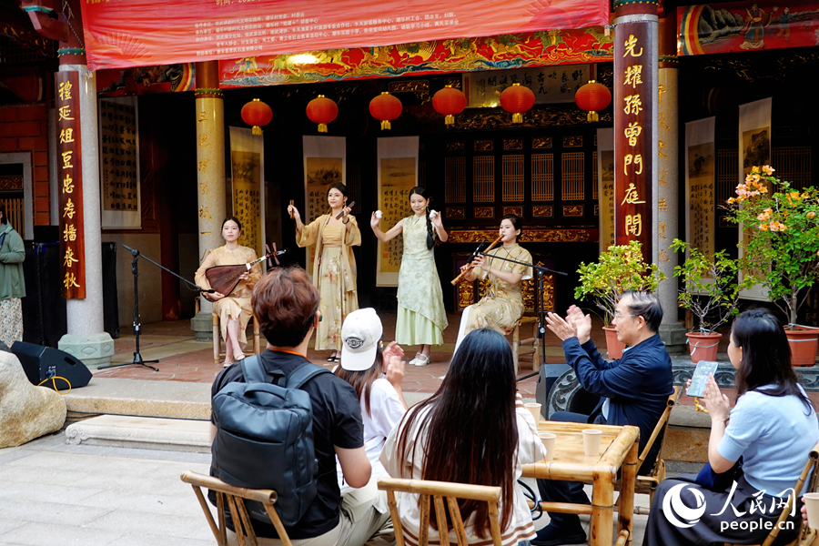 游客在崇武古城的黄吾野祠堂,沉浸式体验南音表演。人民网 杨灏昱摄