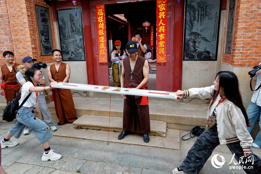 在林氏祖厝的百年石院中,一场“渔家角力”正热火朝天地展开。泉州市非遗项目“渔家角力”代表性传承人张跃阳正手把手指导游客:“腰要沉,劲要活!”